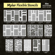 Flexible washable stencils for modelers, made of ultrathin reusable Mylar plastic, which easily adapts to the model surfaces. Valid for brush or airbrush, these stencils can be used in all kinds of dioramas, to simulate all kinds of effects and textures including lettering, and camouflage on planes or armored vehicles, spaceships, and science fiction.